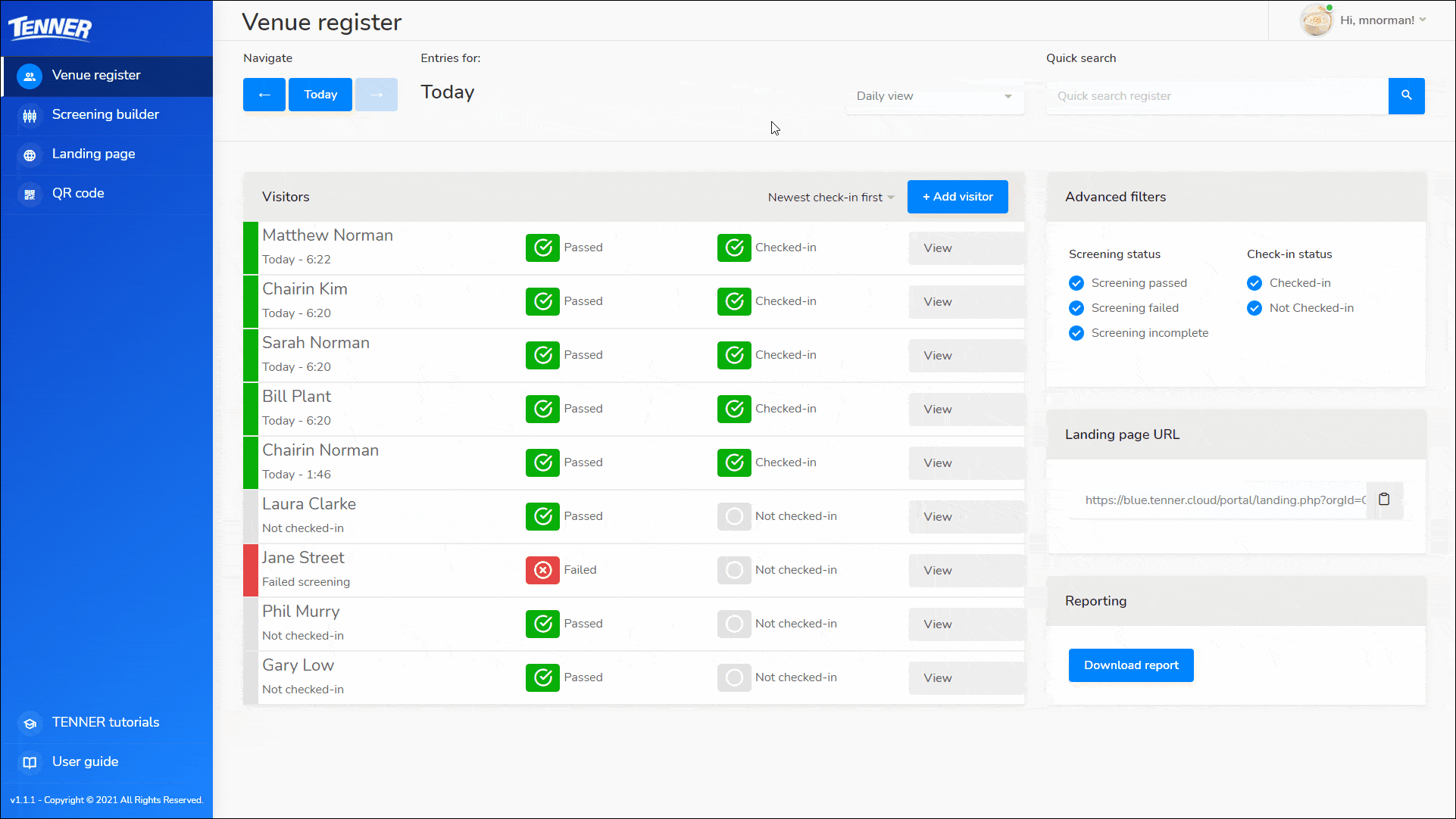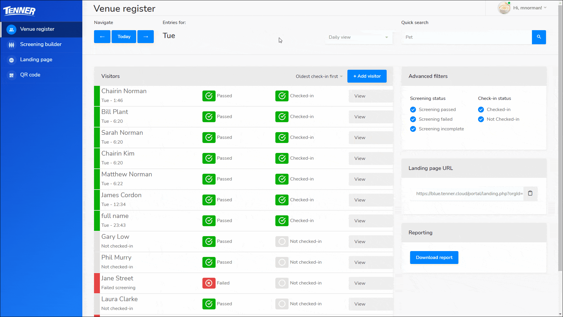If the visitor has not submitted a screening you can manually screen them and check them in by pressing on the ‘+ Add visitor’ button on the venue register page and filling in the information.